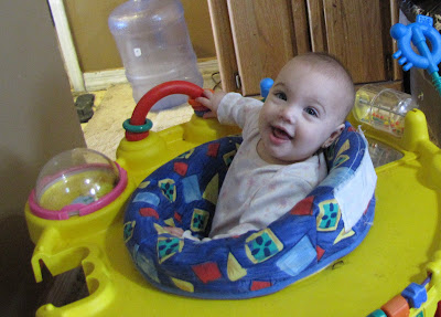 Here is Addy playing in her exersaucer and having a blast. Then we have Jack who is riding his Jeep car outside in the road with Aunt Tanya. Jack is really good at driving this car and just loves it. He didn't at first on christmas day but then after a few rides in it, he has become attached.